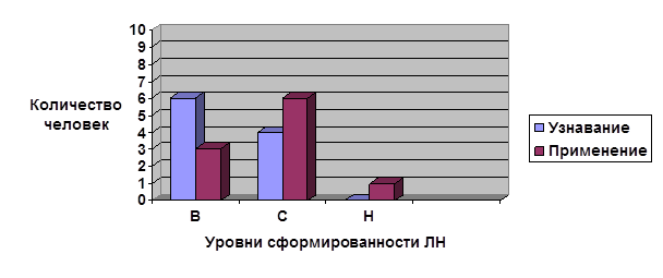 По результатам методики, направленной на применение ЛЕ, оказалось, что у трех человек высокий уровень сформированности ЛН, у шести – средний уровень сформированности ЛН и лишь у одного – низкий уровень сформированности ЛН.