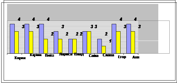 Рис. 3. Данные исследования уровня развития долговременной (1-й столбик) и кратковременной (2-й столбик) памяти кратковременной (2-й столбик) памяти учащихся 2 А класса